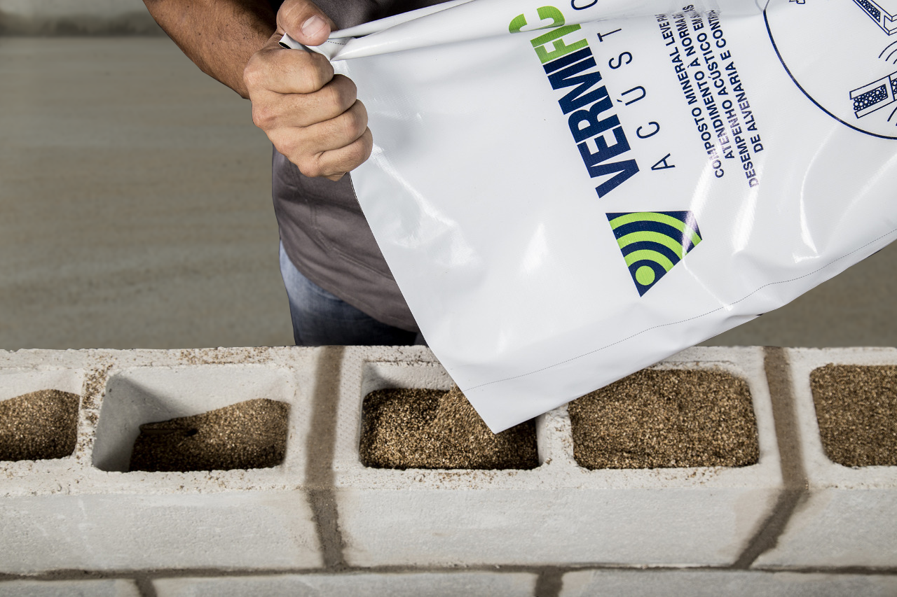 VERMIFLOC Acústico é a melhor opção isolamento acústico de lajes e alvenarias, atendendo à Norma de Desempenho Acústica (NBR 15.575:13). Produto à base de Vermiculita Expandida impregnada com hidrofugantes e elastômeros que confere Isolamento Acústico a paredes e lajes convencionais. Solução de maior DESEMPENHO x ECONOMIA disponível no mercado; TESTADO e APROVADO pelos laboratórios de maior renome nacional; Amplamente recomendado por ESPECIALISTAS em todo Brasil; Sua aplicação é RÁPIDA e SIMPLES, não exigindo mão de obra especializada; É um material LEVE, não sobrecarregando a estrutura; O produto é SEGURO: hidrofugado, não propaga chama, inerte e não tóxico; Adequado para preenchimento de PAREDES e CONTRAPISOS. VERMIFLOC Acústico é uma solução simples e eficaz para isolamento sonoro de paredes. Ao ser aplicado diretamente no preenchimento dos espaços confinados dos blocos de alvenaria (seja cerâmico ou de concreto), o produto garante melhoria do desempenho acústico a fim de atender aos requisitos da NBR 15575. VERMIFLOC Acústico também promove isolamento a ruídos de impacto em pisos. Utilizado como agregado da argamassa cimentícia, resulta num Contrapiso monolítico com propriedades de isolamento acústico aderido à laje, dispensando a utilização de mantas e sistemas flutuantes para atendimento da Norma de Desempenho.USO EM PAREDE